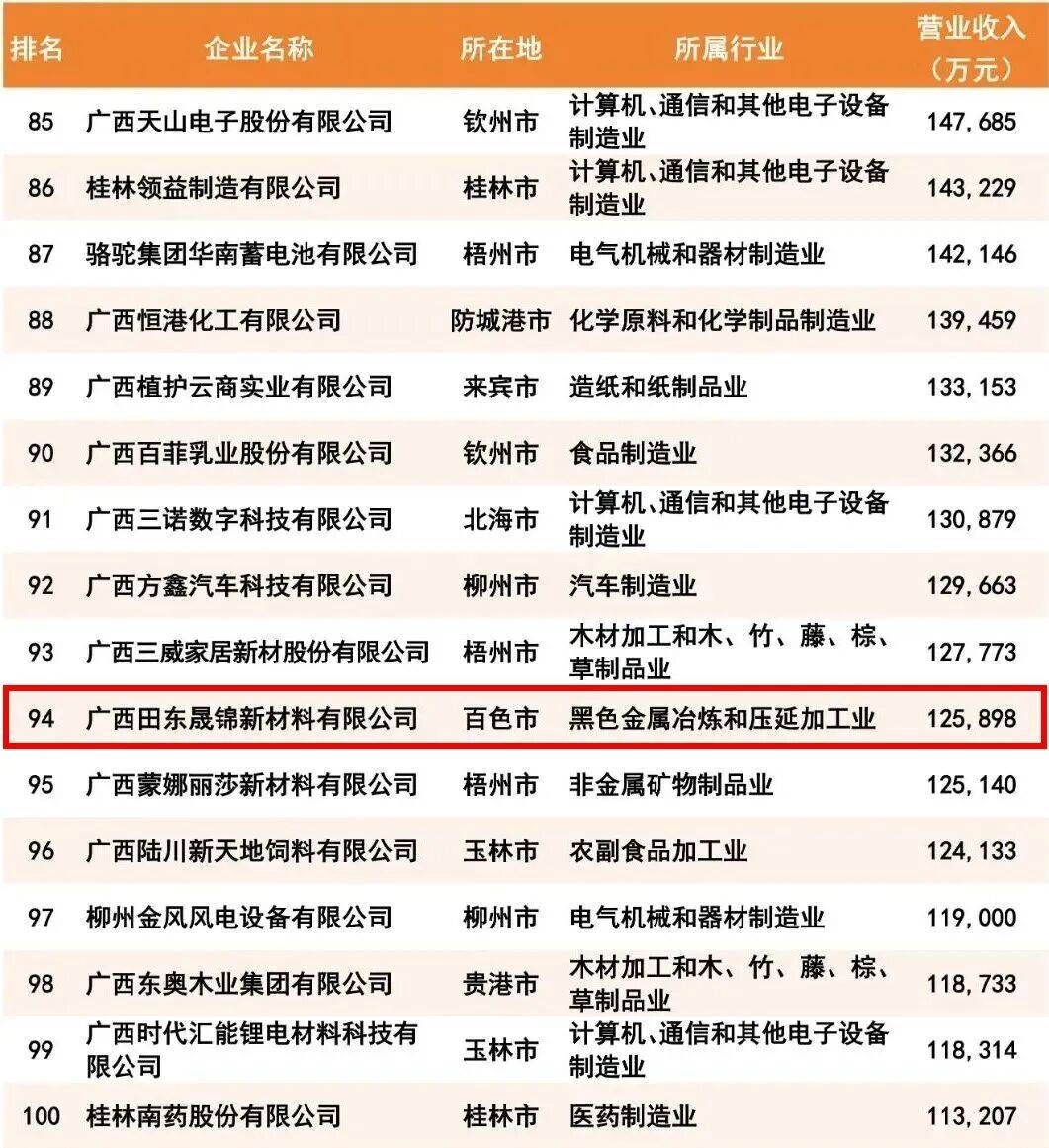 广西盛隆冶金有限公司以1113.069亿元的营业收入位列民企100强榜首,位列榜单第二、三位的 广西南丹南方金属有限公司、桂林力源粮油食品集团有限公司,营业收入分别为668.2028亿元、460.395亿元, 吉利百矿集团有限公司、广西贵港钢铁集团有限公司紧随其后。这5家公司同样入围了“2025广西制造业民营企业100强”。