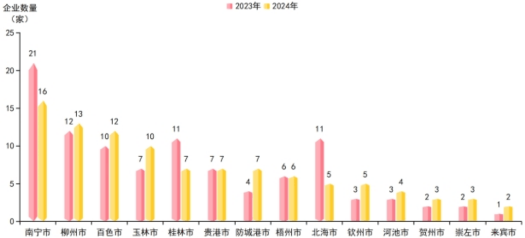 2025民企100强覆盖全区14个地市,区域分布趋向均衡,其中南宁16家、柳州13家、百色12家、玉林10家、桂林7家、贵港7家、防城港7家、梧州6家,这8个地市的民营企业数量占据百强榜过半。