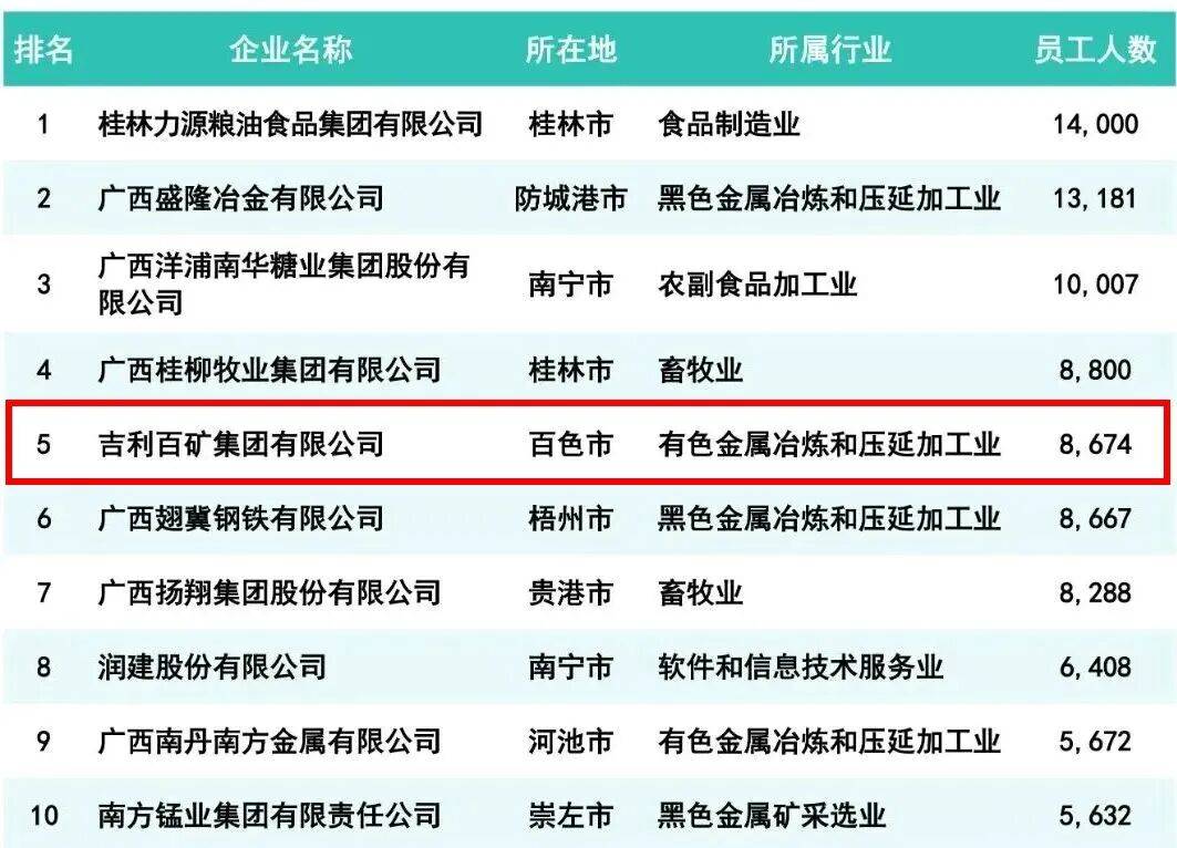 三、上榜2025广西民营企业吸纳就业10强的有1家,为吉利百矿集团有限公司,与2024年上榜数持平。